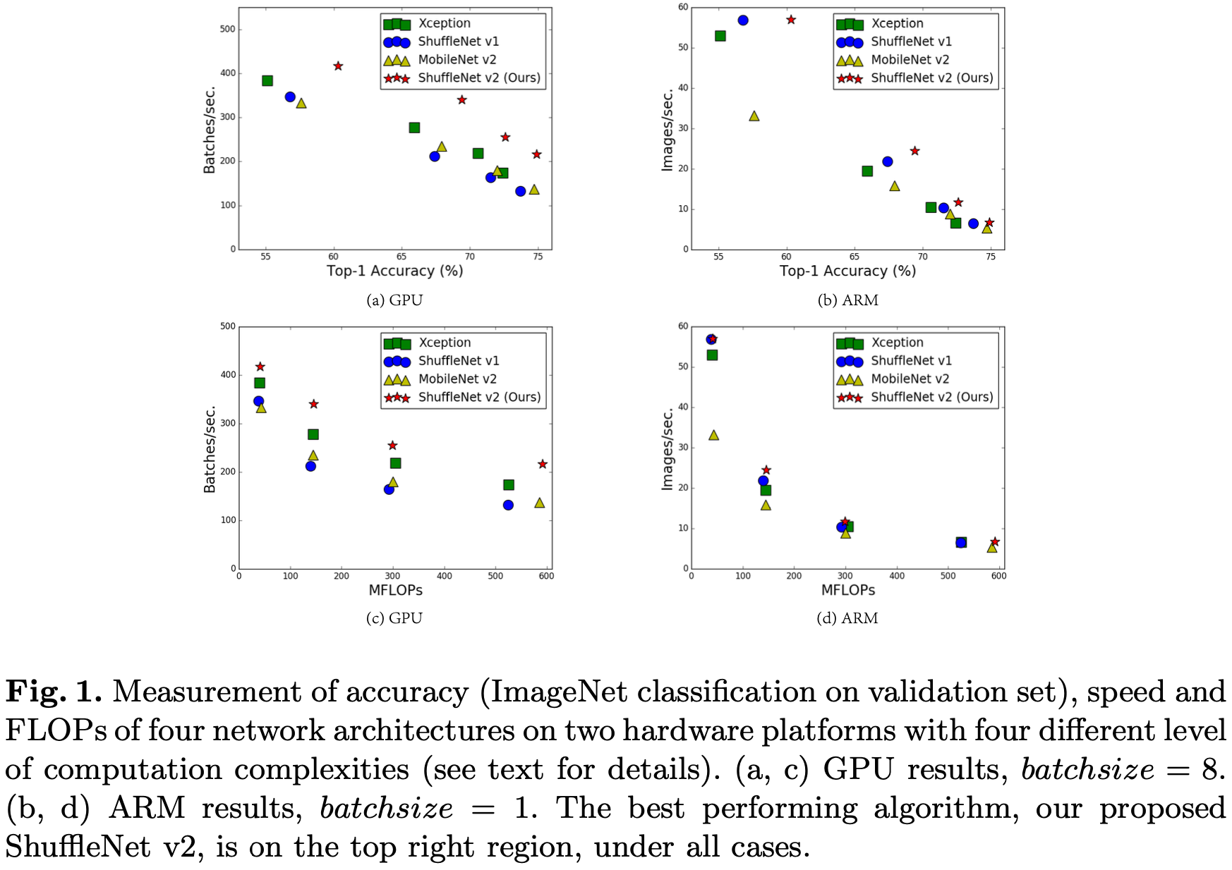 在论文中,作者对 Xception, ShffuleNet V1/V2, MobileNet V2进行了详细测试: