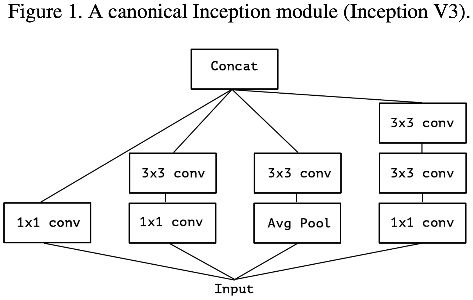受到 Network In Network以及 HeHebbian Principle 的启发,作者通过增加网络的宽度,从而提高网络的表达能力,并尝试找到卷积神经网络中的最优局部稀疏结构,即 Inception Module(如上图所示)。